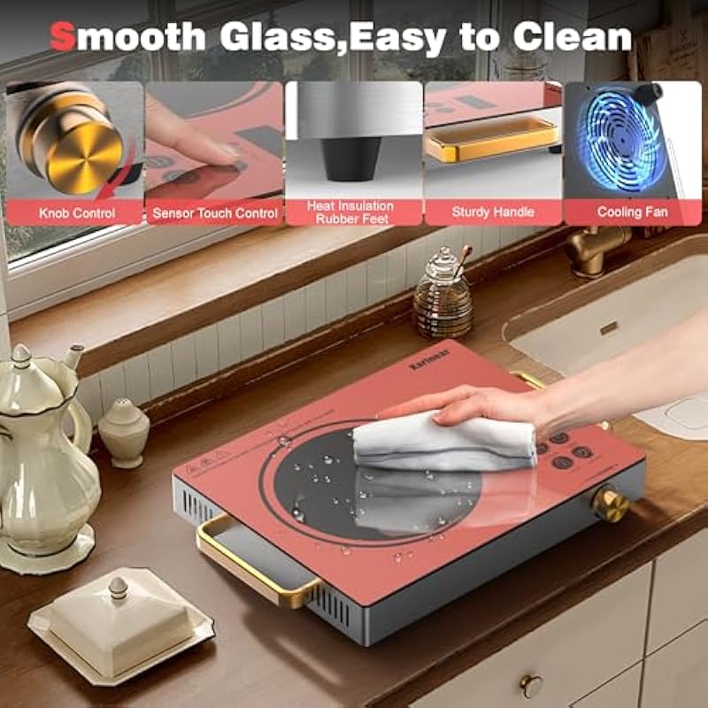 - 【Knob & Sensor Touch Control】The front-facing rotary knob allows you to adjust the countertop burner power from 100W to 1800W easily, giving you precise control over your cooking. The touch control panel on the portable stove top right side features pre-set functions for BBQ, Stir Fry, and Steam, making it versatile for various cooking methods.