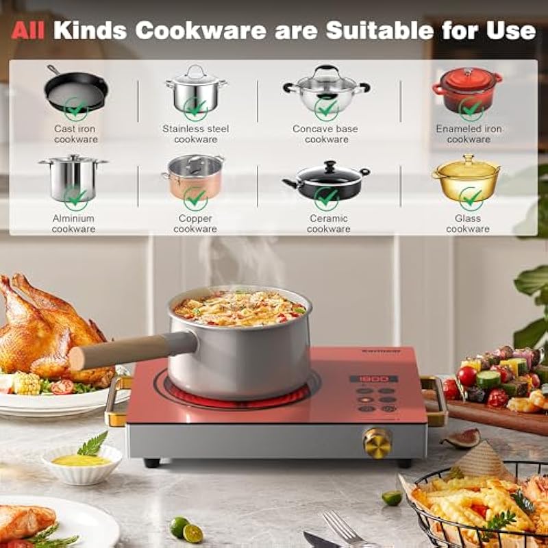 - 【Compatible with All Kinds of Cookware】 This electric ceramic cooktop is compatible with a variety of heat-resistant cookware, including glass, ceramic, iron, and stainless steel, offering more flexibility compared to induction cooktops. Elevate your cooking game with our powerful, portable, and safe electric cooktop.