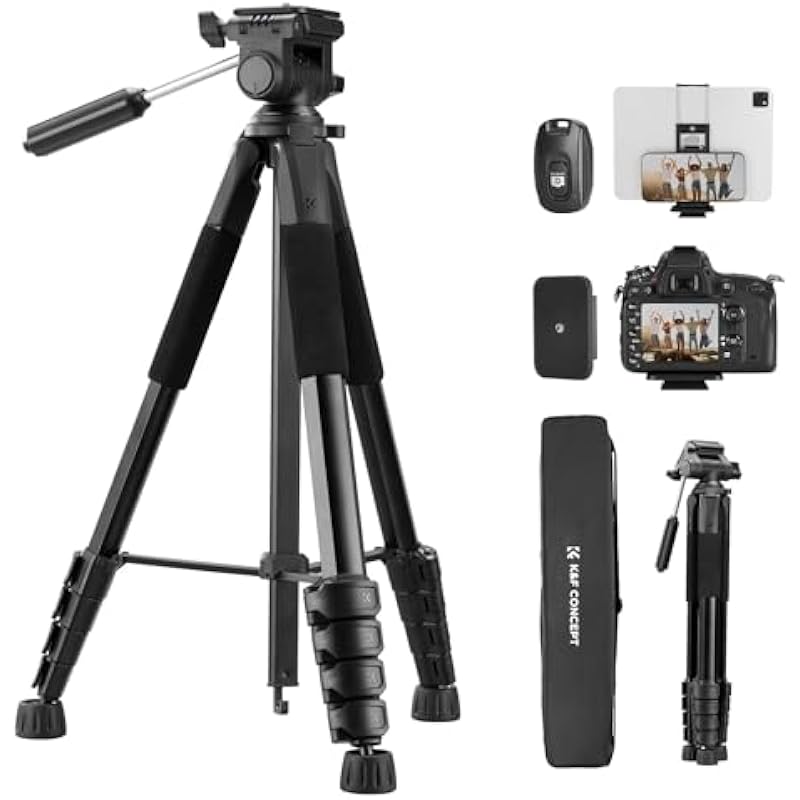 K&F CONCEPT Camera Tripod, 75″ Lightweight Portable Travel Outdoor DSLR Tripods for Camera Phone Video Recording Tripod Stand, Cellphone Clip for Smartphone Live Streaming Vlog, Black