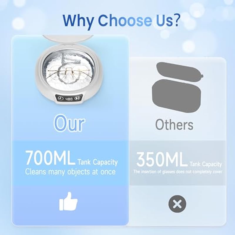 - Spacious Design for Efficiency: The ultrasonic jewelry cleaner features a 700ml near-circular stainless steel tank, providing ample space for multiple items such as glasses, silver, gold jewelry, diamonds, rings, and watches. The Jewelry cleaner ultrasonic machine is thoughtfully engineered to reduce repeated cleanings—saving both time and effort while maximizing cleaning efficiency.