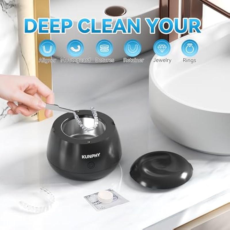 KUNPHY Ultrasonic Retainer Cleaner, 48kHz Denture Cleaner Machine with Cleaning Tablets, Water-Proof Dental Cleaning Pod for Deep Cleaning Night Guard, Mouth Guard, Aligner, Jewelry, Black