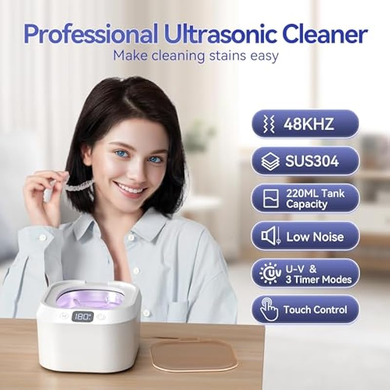 KUNPHY Ultrasonic Retainer Cleaner Machine, 48KHz Professional Sonic Cleaner with Touch Operation, 7.5 Oz Sonic Cleaner Machine for Jewelry, Braces, Mouth Guard, Watch (White)