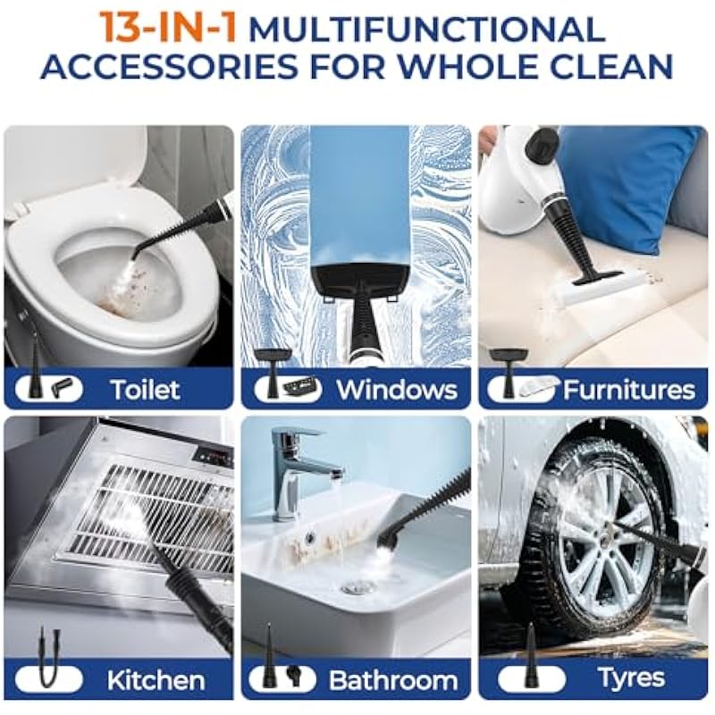 - 13PCS STEAM CLEANER SET: LABIGO handheld steam cleaner comes with 13 attachments, allowing you to easily interchange attachments to tackle any surface in your kitchen, bathroom, car, living room or fabric/clothing