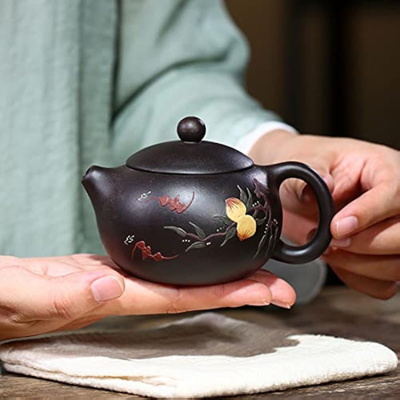 - Chinese zisha pot,Black clay painted with bats and longevity peaches,classical xishi tea pot ,Maximum carrying capacity 7oz (about 210ml) .