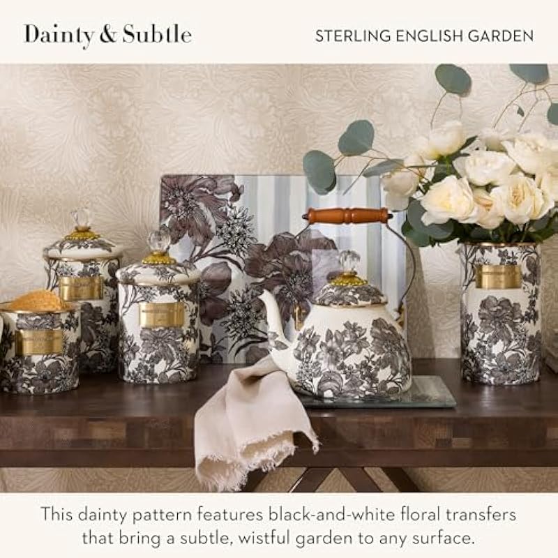 - ELEGANT FLORAL TEA KETTLE: The dainty Sterling English Garden stove kettle features a white hand-glazed heavy-gauge steel underbody decorated with black-and-white flowers. It’s topped with a wood handle and a clear glass knob.