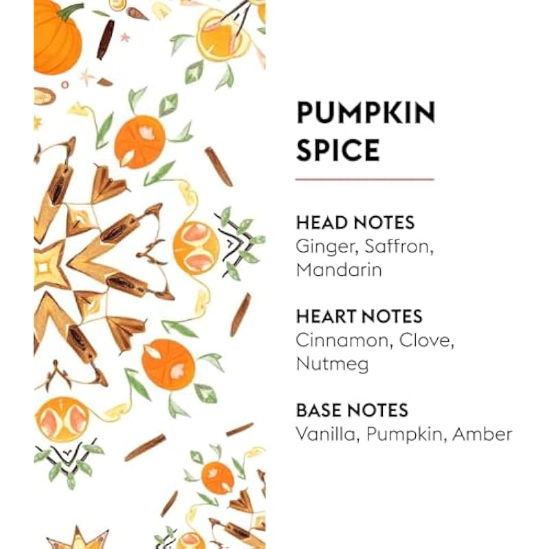 - PUMPKIN SPICE: AUTUMN’S EMBRACE IN EVERY DROP Picture the first sip of spiced cider, the comforting aroma of freshly baked pumpkin pie, the crisp air of harvest evenings – this complex blend opens with bright mandarin and spicy ginger, deepens with cinnamon, clove and nutmeg, then settles into a creamy base of vanilla, pumpkin and golden amber. Each note tells a story of fall’s rich traditions.