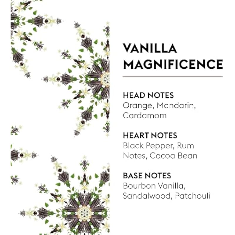 - VANILLA MAGNIFICENCE – A decadent, multi-layered fragrance with top notes of orange, mandarin, and cardamom, a spicy-heart of black pepper, rum, and cocoa bean, and a deep base of Bourbon vanilla, sandalwood, and patchouli for a seductive, long-lasting aroma.