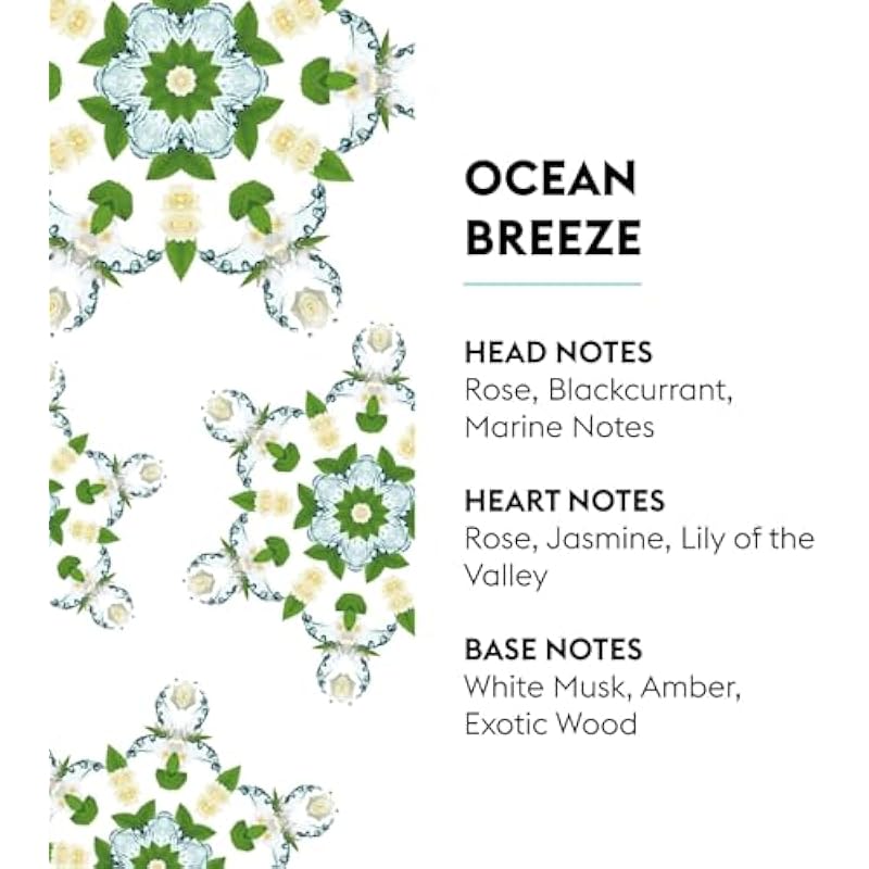 - Ocean Breeze offers aromas of an invigorating sea swell, a floral bouquet, and exotic wood that transport you to a seaside getaway. TOP NOTES Rose, Blackcurrant, Marine Notes – HEART NOTES – Rose, Jasmine, Lily of the Valley – BASE NOTES – White Musk, Amber, Exotic Wood