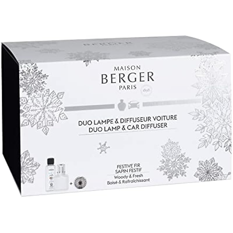 MAISON BERGER Mixed Gift Set – Holiday Collection – Includes Lamp Gift Set + Fragrance Festive Fir 8.45 Fluid Onces – 250 milliliters + Refillable Car Vent Clip Diffuser Set