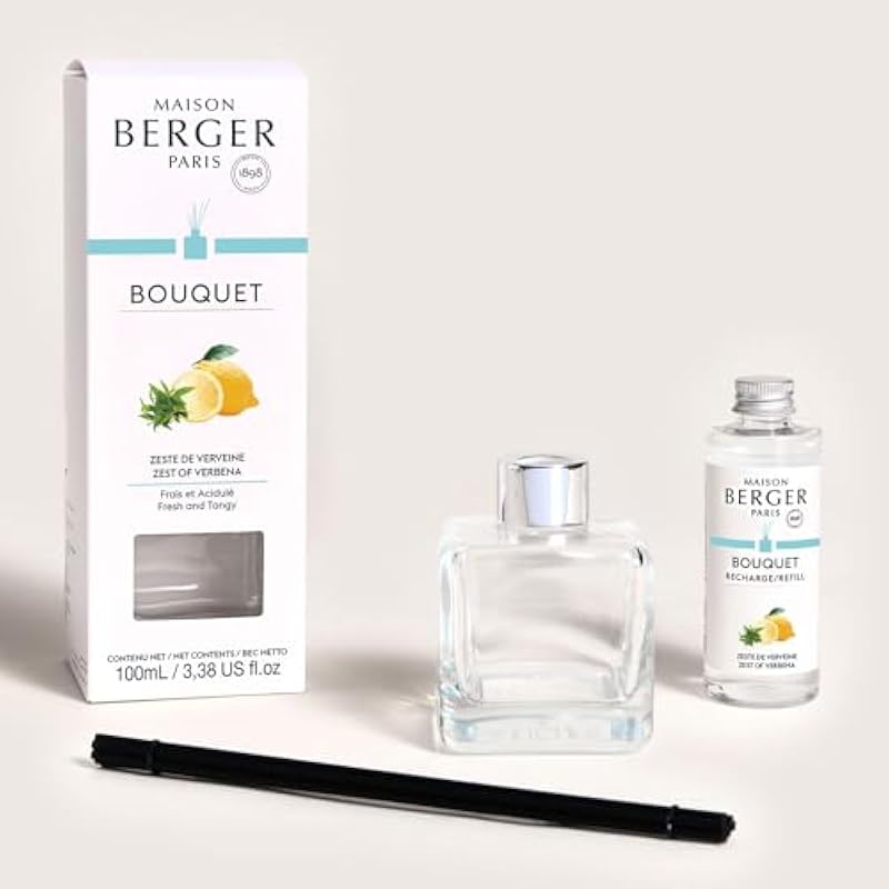 MAISON BERGER – Reed Diffuser Clear Glass Scented Bouquet – 8 Black Reed Sticks (8.3 inches) – Includes 100 Milliliters (3.4 Fluid Ounces) Fragrance Refill (Zest of Verbena)