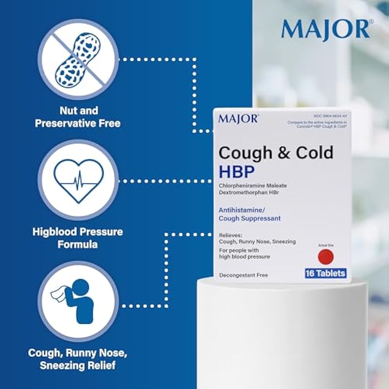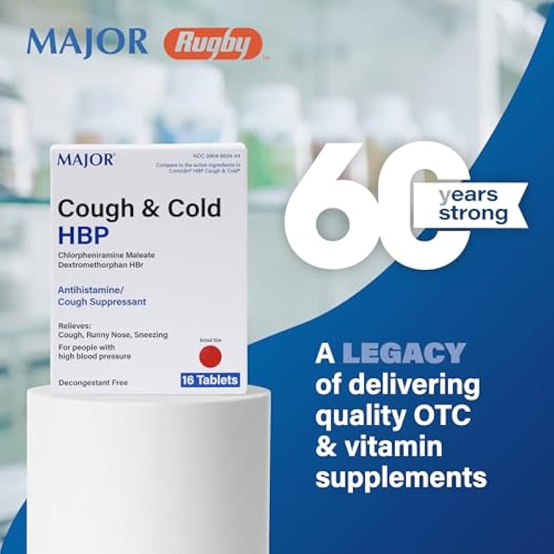 MAJOR Cough and Cold HBP Tablets – Antihistamine and Cough Suppressant for People with High Blood Pressure – Dextromethorphan HBr, Chlorpheniramine Maleate – 16 Count (6 Pack)