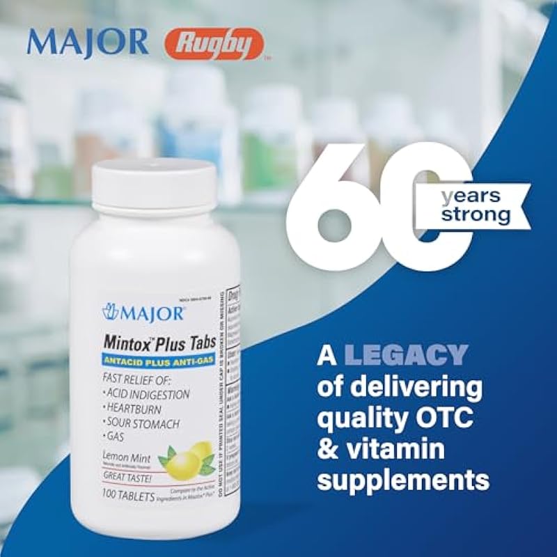 MAJOR Mintox Plus Tabs – Antacid Plus Anti-Gas Tablets – Helps Quickly Relieve Acid Indigestion, Heartburn, Sour Stomach, and Gas – Lemon Mint Flavored – 100 Count (1 Pack)