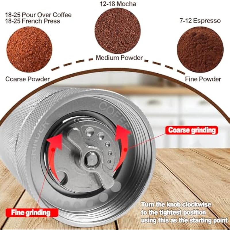 - “CNC420 Stainless Steel Burr:Enjoy a consistent grind every time with our manual coffee grinder featuring CNC420 stainless steel burrs. Designed for durability and precision, the burr uniform particle size for richer flavor extraction. This precise grinding better preserves the rich aroma and essential oils of the coffee beans, allowing you to savor a cup of coffee with a well – balanced flavor, whether it’s a morning pick – me – up or an afternoon treat ”