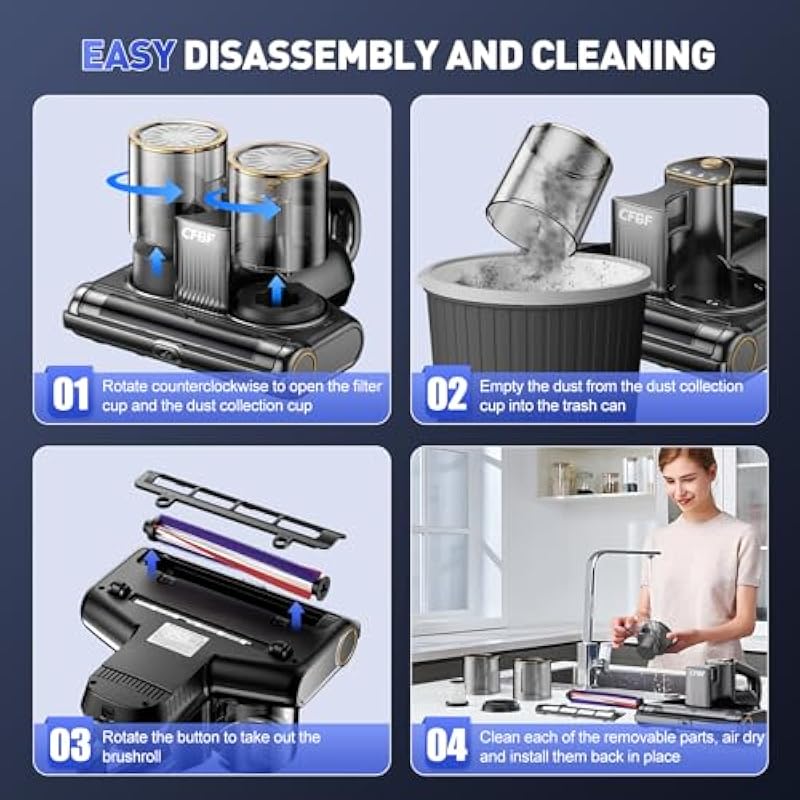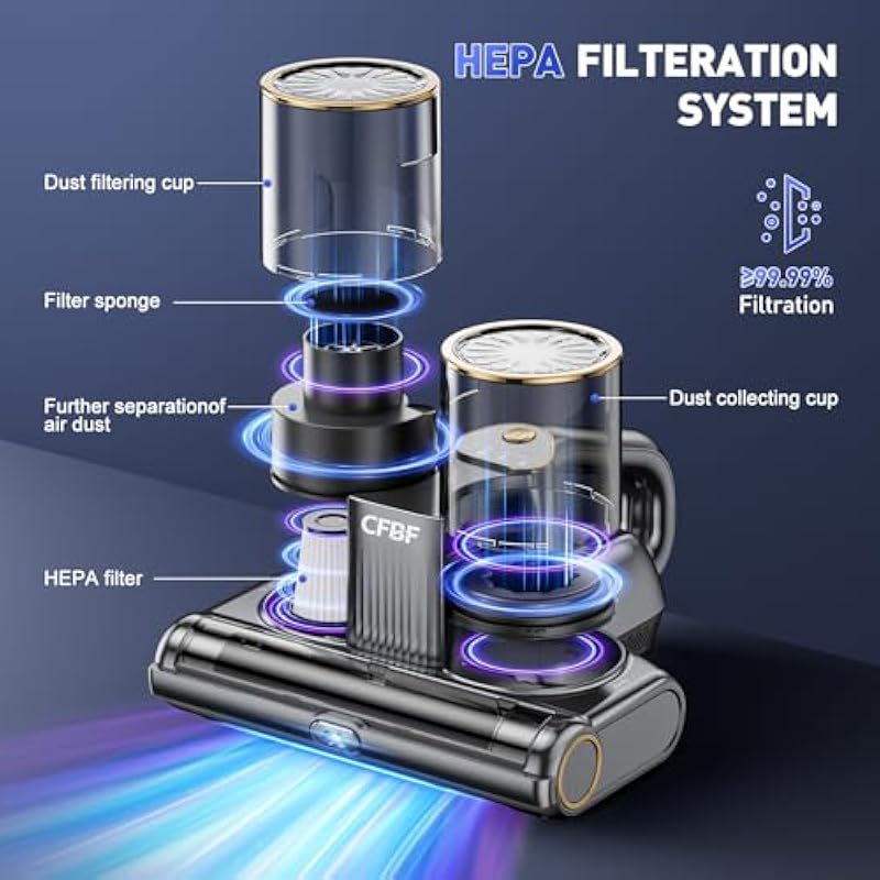 - ➿【DUAL-CUP FILTERATION SYSTEM】The mattress cleaner adopts high speed motor dual cyclone filtration technology, which can easily separate dust and hair, effectively avoiding the common clogging problems of ordinary bed vacuum cleaner. Equipped with a HEPA filter that effectively filters 99.99% of tiny particles. Washable and reusable dual cup and filter design is easy to disassemble, and with the included small brush, cleaning becomes easier and faster