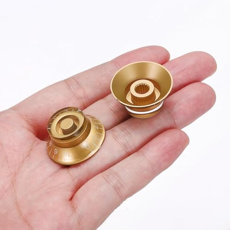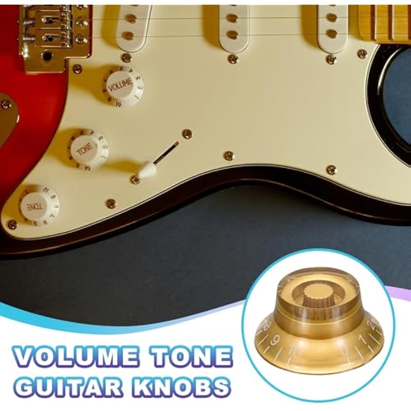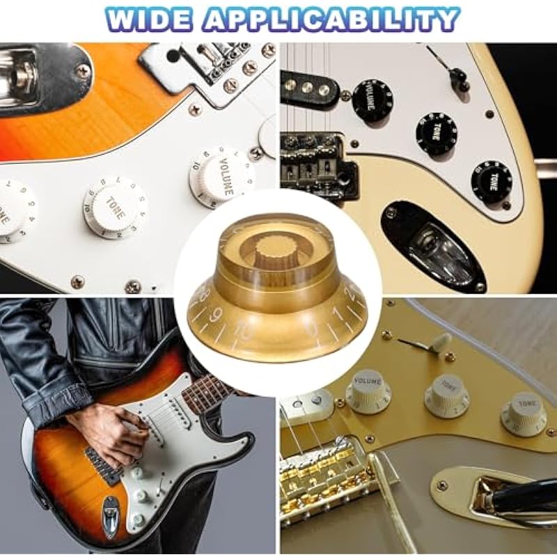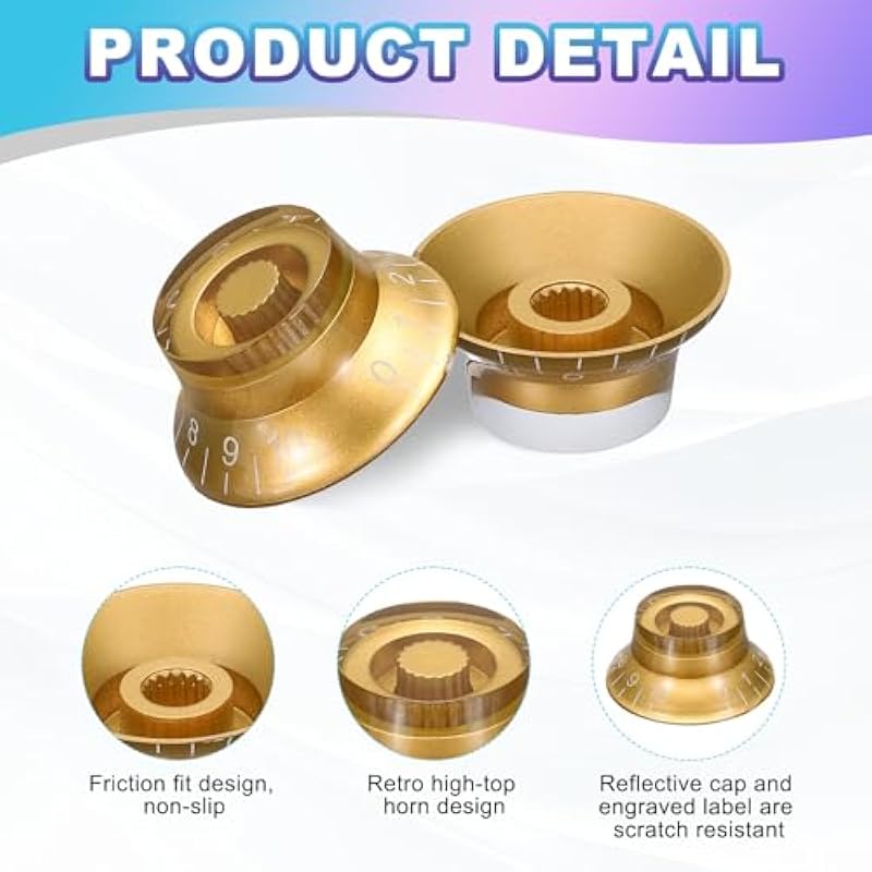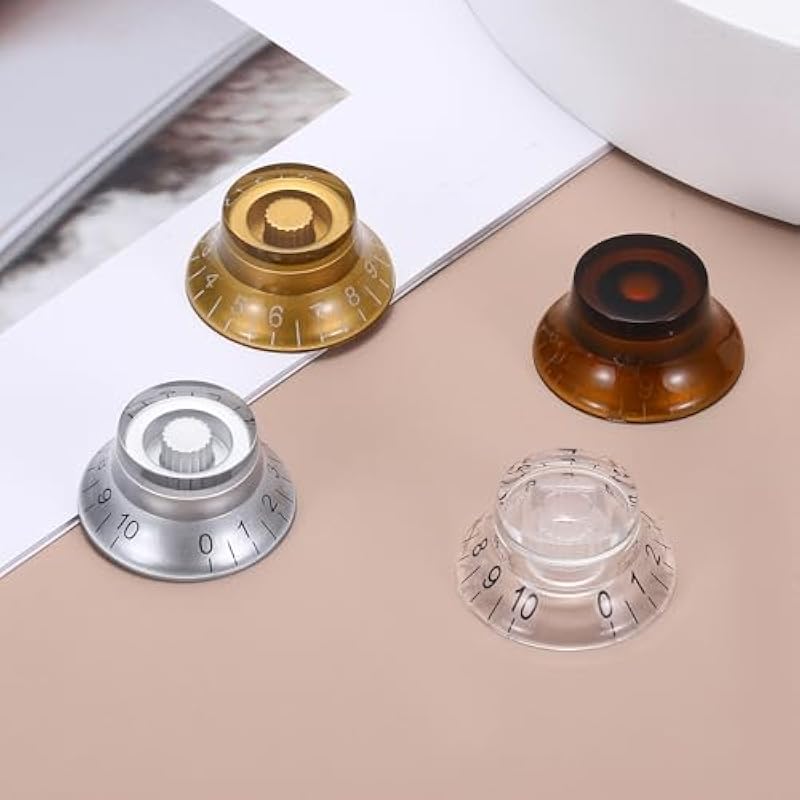 - The guitar knob is made of good materials, durable and scratch-resistant, with a long service life. The reflective cap and engraved label add visual effects on stage. Easy installation, no screws or tools are required to complete the setup; the friction fit design provides precise control and ensures non-slip during music performances. The retro high-top bell design and reflective cap perfectly combine retro style with precise speed/volume adjustment.
