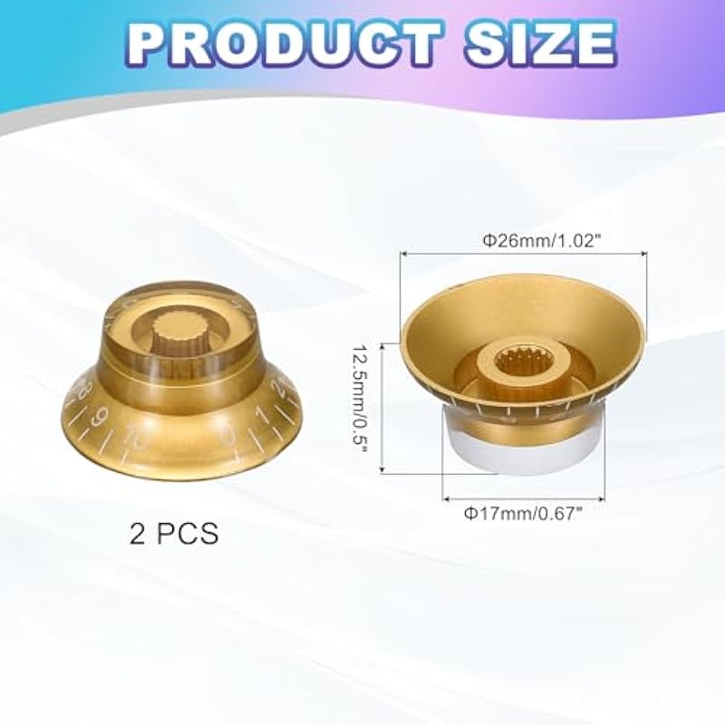 - Electric Guitar Knobs, Color: Gold White, Material: Acrylic + Plastic, Size: 26x17x12.5mm/1.02×0.67×0.5 inch(IDxODxH), In the package: 2 x Guitar Knobs