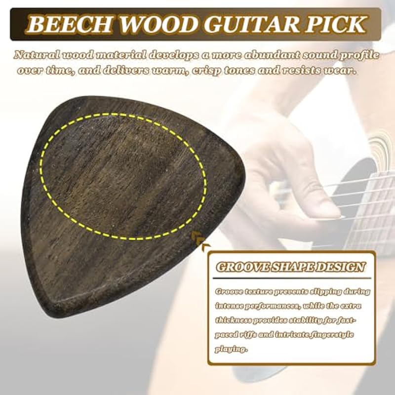- The wood guitar picks are designed for musicians seeking superior control, the innovative groove texture prevents slipping during intense performances, while the extra thickness provides stability for fast-paced riffs and intricate fingerstyle playing. Natural wood material develops a more abundant sound profile over time, and delivers warm, crisp tones and resists wear.