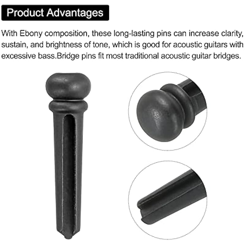 - With Ebony composition, these long-lasting pins can increase clarity, sustain, and brightness of tone, which is good for acoustic guitars with excessive bass.Bridge pins fit most traditional acoustic guitar bridges