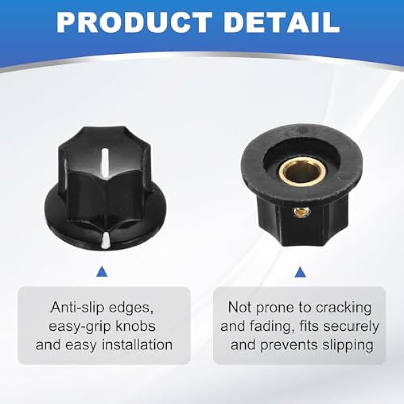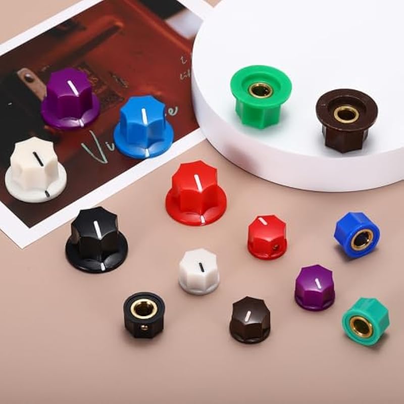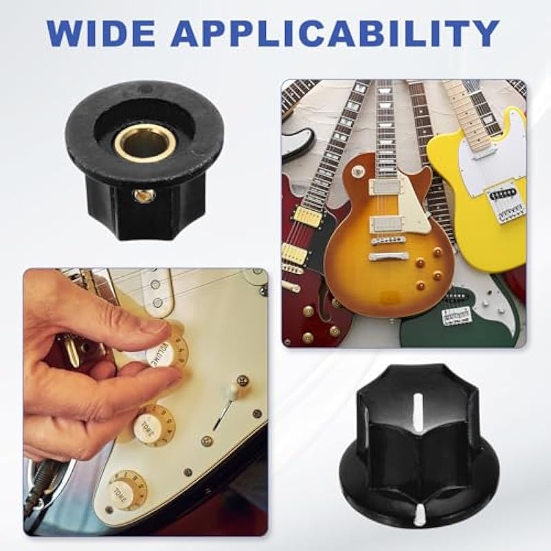 - This potentiometer knob is stylish and durable, designed for guitar amplifiers, effects and audio equipment. Widely used in guitar effect pedals, electric guitars, synthesizers, amplifiers, audio equipment, to control tone, volume, speed, sound, etc. It can fit tightly with standard potentiometers while adding a modern and beautiful look to your equipment.