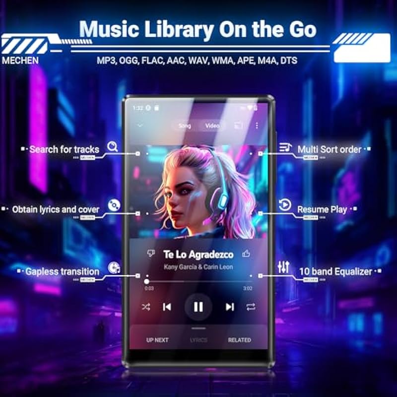 MECHEN 256GB WiFi MP3 Player with Bluetooth, Android 13 and Wi-Fi Streaming, 5″ 1080P IPS Display, preinstalled Audible, Amazon Music, Spotify, Play Store