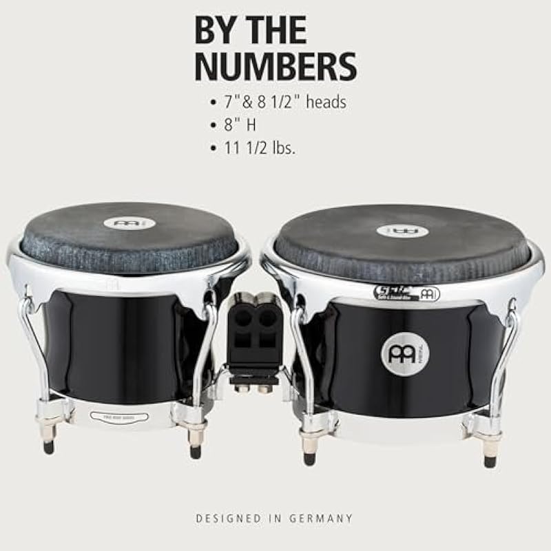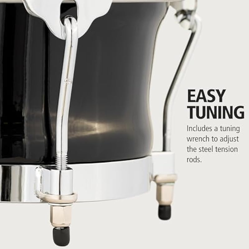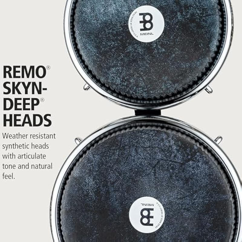 - Remo Black Calfskin Skyndeep Heads — these bongos come equipped with Remo Black Calfskin Skyndeep heads that deliver increased volume and resonance while featuring a striking appearance — the heads measure 7” and 8 ½”