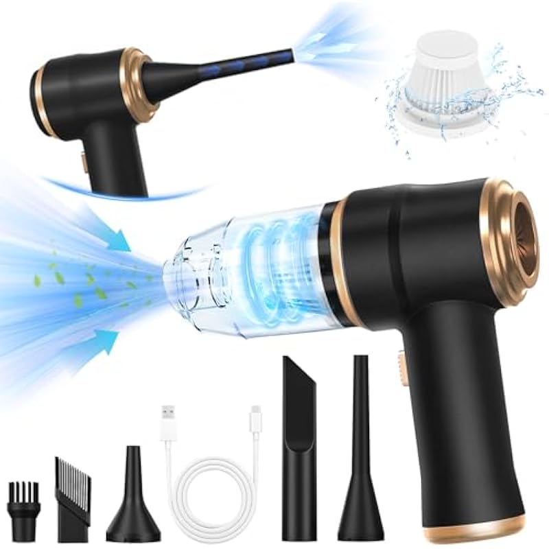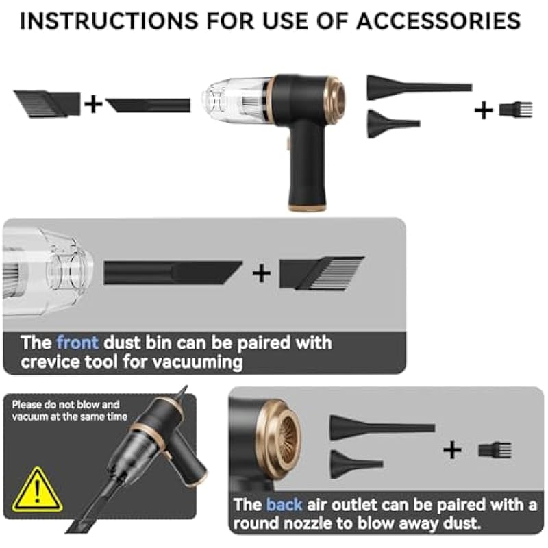 - VACUUM & BLOW: You can easily use it to blow away dirt, debris, dust, and other particles on the surface of objects, as well as suck out tiny stubborn dirt hidden in keyboards, corners, and crevices. Vacuum on the front and blow on the back. Please note that different nozzles correspond to different interfaces on the front and back of the vacuum cleaner