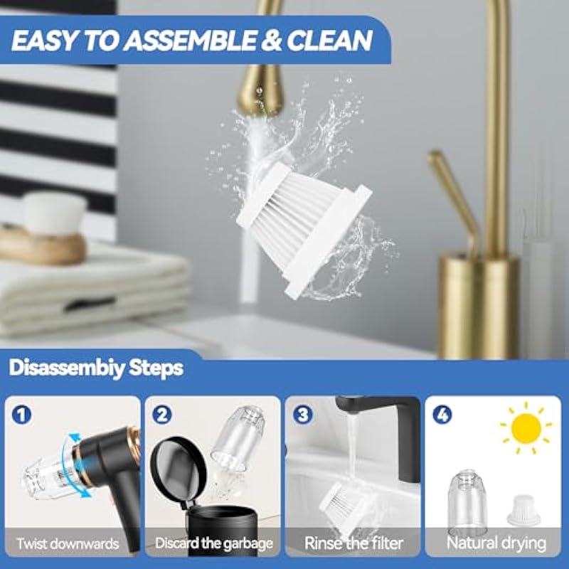 - EASY CLEANING & REUSE: The semi transparent dirt bowl allows you to see the level of dirt, so you always know when to empty it. The washable trash can and Hepa filter can be directly cleaned in the sink. The dry Hepa filter ensures effective suction of the cordless vacuum cleaner while keeping dust and dirt out to prevent clogging