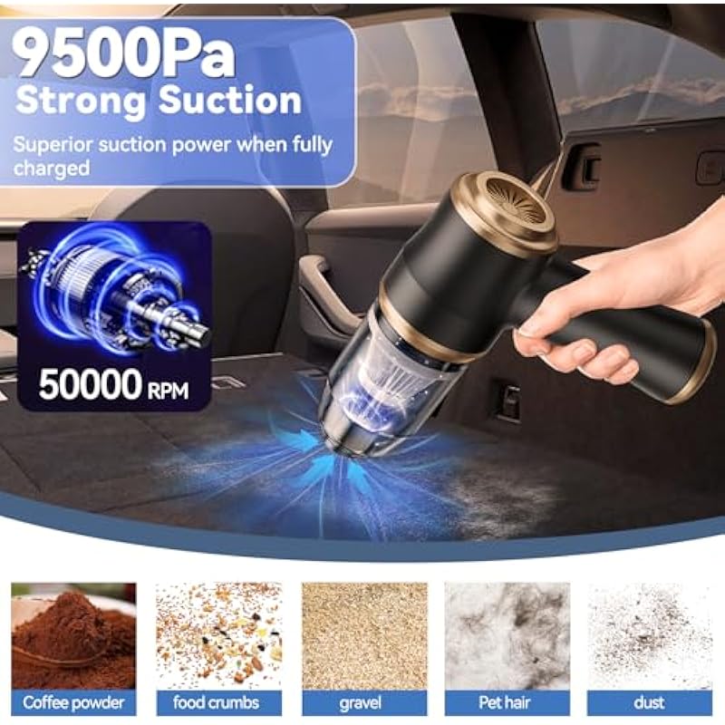 - POWERFUL SUCTION: The portable car vacuum adopts advanced motors, with a maximum speed of up to 50000RPM. The built-in 4000mAh battery comes with a protective plate to ensure safe charging and use. Equipped with C-type charging cable