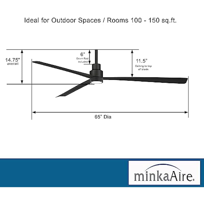 - DIMENSIONS: Measures 14.5” from the ceiling to the lowest point of the fan with the included 6″ downrod. This Sleek Ceiling Fan has a blade sweep diameter of 65” with 14° Blade Pitch