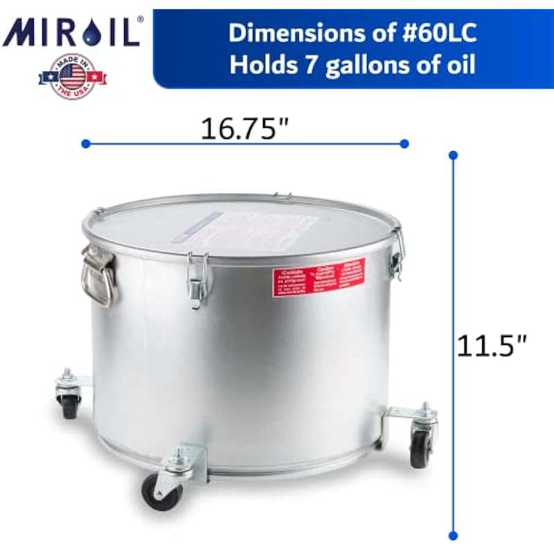 - SAFE, SPILL RESISTANT STORAGE & TRANSPORT FOR COOKING OIL – Designed for commercial kitchens, restaurants, and food trucks, the MirOil 60LC Oil Utility Pail offers a reliable solution for safely disposing of and storing up to 55 lbs. (7 gallons) of used cooking oil. Built from heavy-duty materials for long-lasting durability, it accommodates a wide range of oils including peanut oil, vegetable oil, and other fryer oils. The included tight-sealing lid locks in odors and prevents leaks, ensuring clean, secure storage and transport.