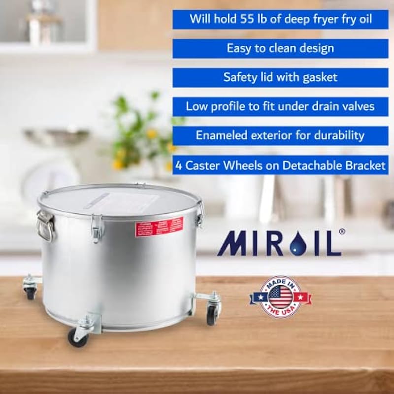 - HEAVY-DUTY OIL CADDY WITH CASTERS – Effortlessly move and store used fryer oil or food waste with the MirOil 60LC Oil Utility Pail, designed with smooth-rolling casters for maximum maneuverability in busy commercial kitchens. Built from heavy-duty steel with a durable enameled exterior, this oil caddy is made to withstand frequent use and harsh environments. Its low-profile design easily fits under fryer drain valves, making oil draining and collection safer and more efficient. Ideal for restaurants, cafeterias, and food service operations.