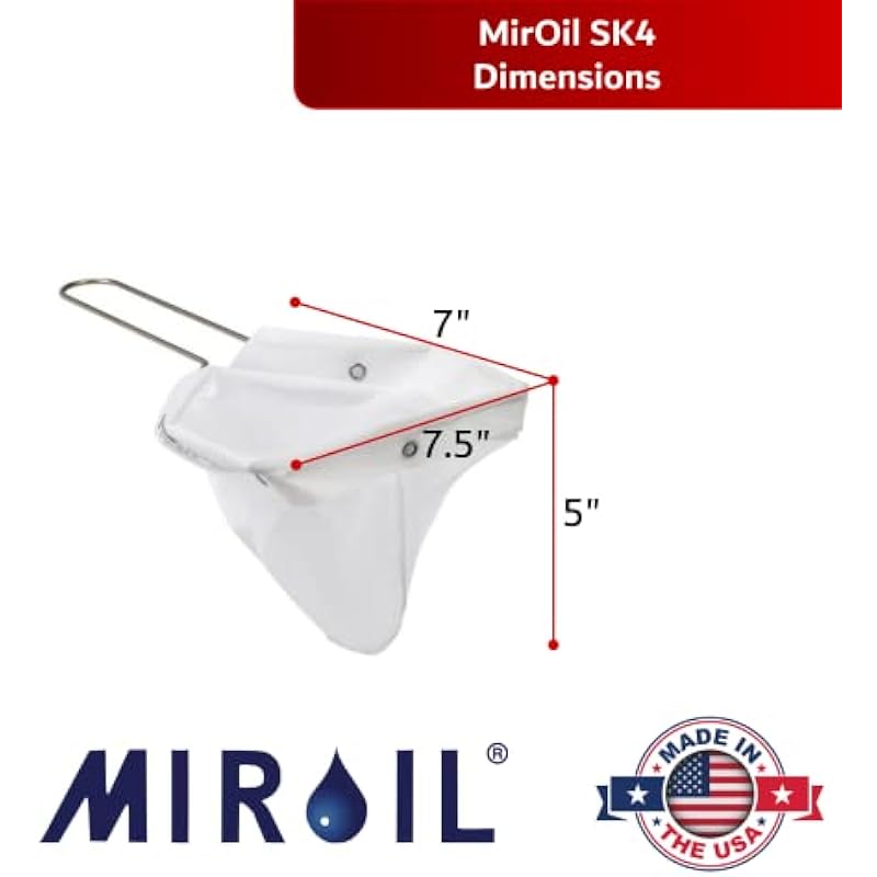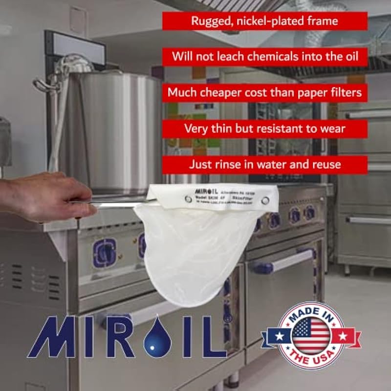 - DURABLE REUSABLE OIL FILTER STRAINER FOR FRYERS – Improve oil quality and extend oil life with the MirOil SKIM4F Reusable Oil Filter Bag and Frame Set (Model #: SKIM4F / 02780). Designed for heavy-duty use in commercial kitchens, food trucks, concession stands, and home deep fryers, this premium filtration solution features a durable nickel-plated steel frame and a high-performance 45-micron nylon filter bag. Ideal for filtering used fryer oil.