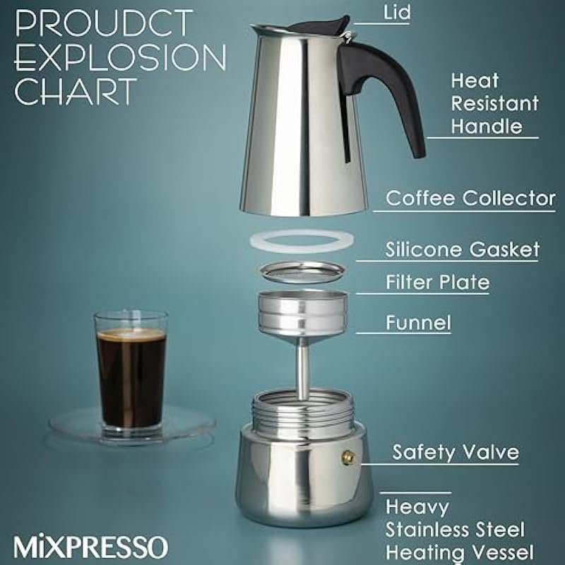 - Stainless Steel Moka Pot: The espresso maker stove top is stainless steel heavy-duty and has a non-reactive interior that is good for all heat sources, including gas, ceramic, or electric stoves.