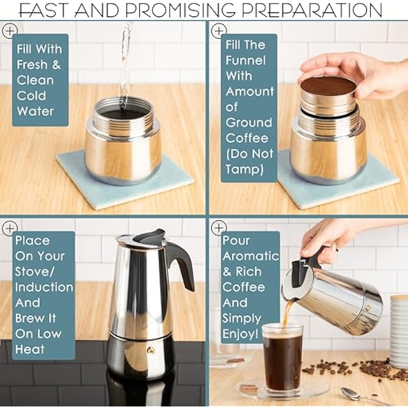 - Easy To Use Espresso Pot: Fill the lower part of the three-part with water, put the ground coffee into the basket, put the top on, and place the stainless steel espresso pot on a cooker to boil. Your expresso is ready in minutes!