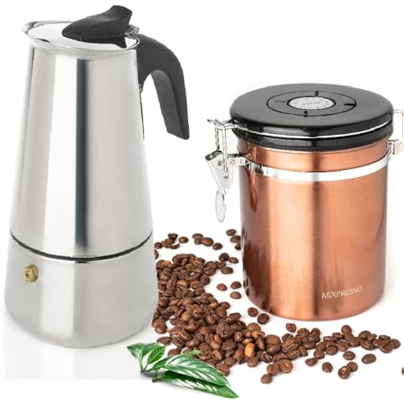 Mixpresso Bronze Stainless Steel Airtight Coffee Container with Date Tracker & 9 Cup Greca Stovetop Espresso Maker, Vacuum Sealed, 16 Ounces, Bronze