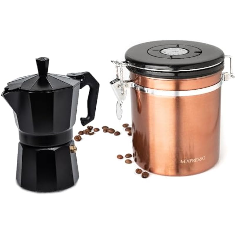 Mixpresso Bronze Stainless Steel Airtight Coffee Container with Date Tracker For Coffee & Tea, Coffee Jar 16 Ounces Bundle With Aluminum Moka Stove Coffee Maker, Black Espresso Maker Stovetop, Excelle