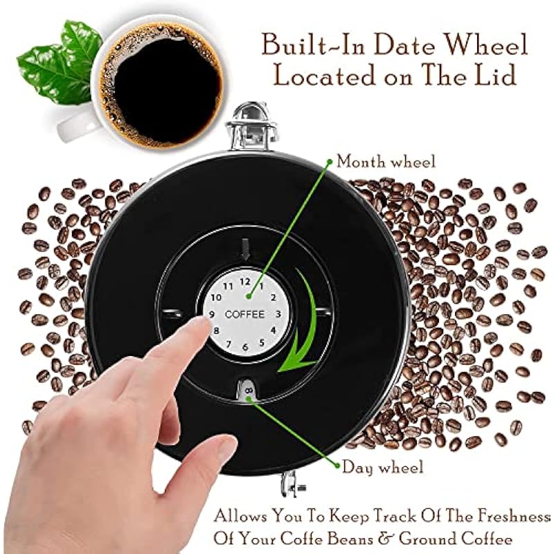 - Storage Space: The air tight container provides enough storage space, 16 oz (1lb), to keep a nice stash of your favorite grounded coffee or coffee beans. The fresh-built-in date wheel on the lid lets you keep track of the freshness of your coffe beans & ground coffee.