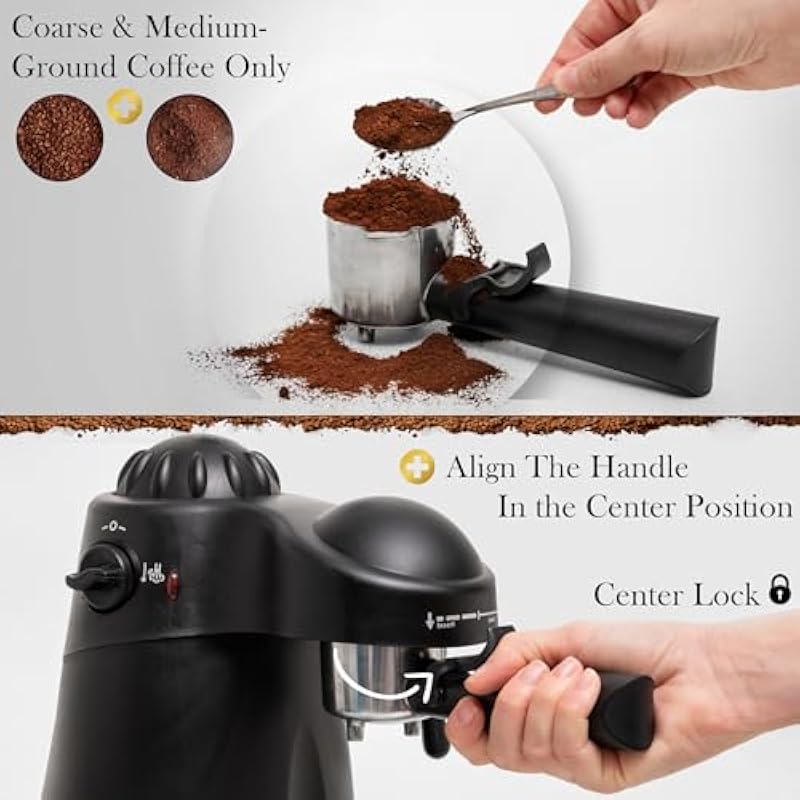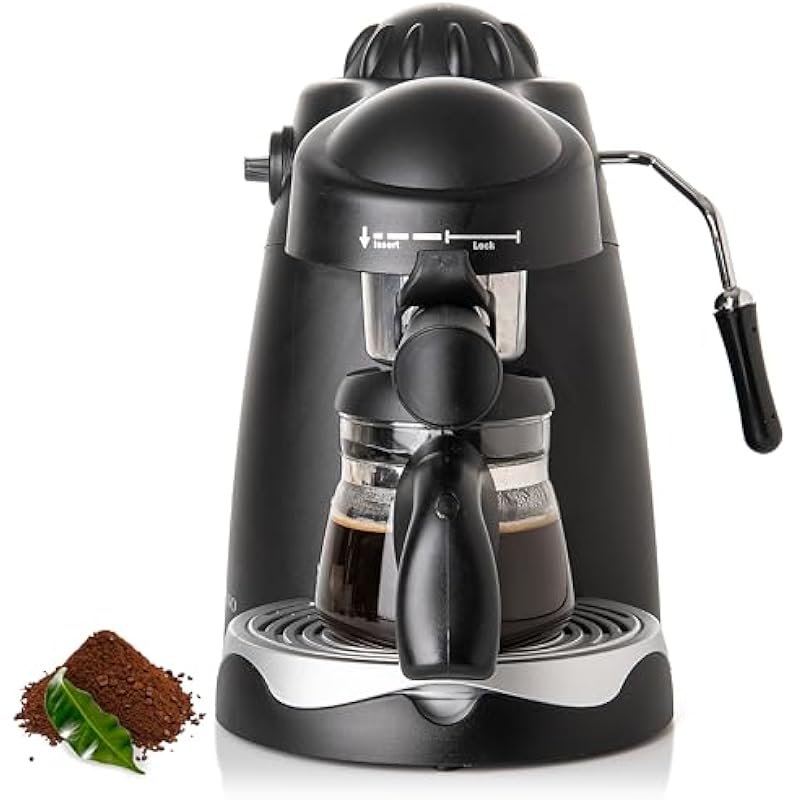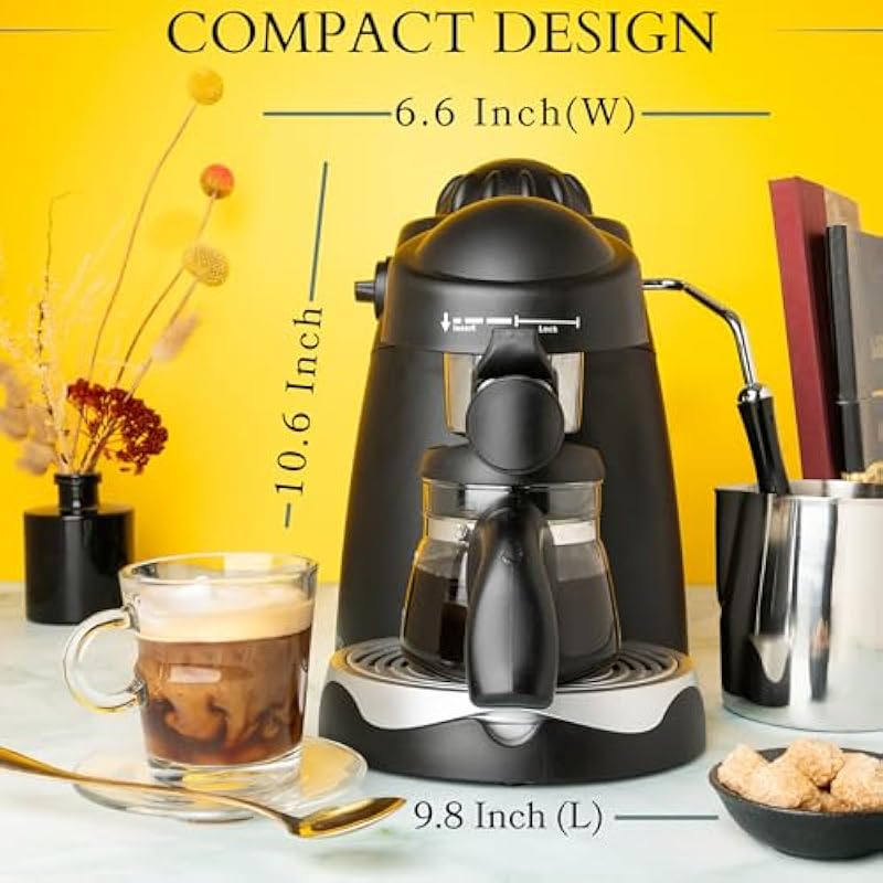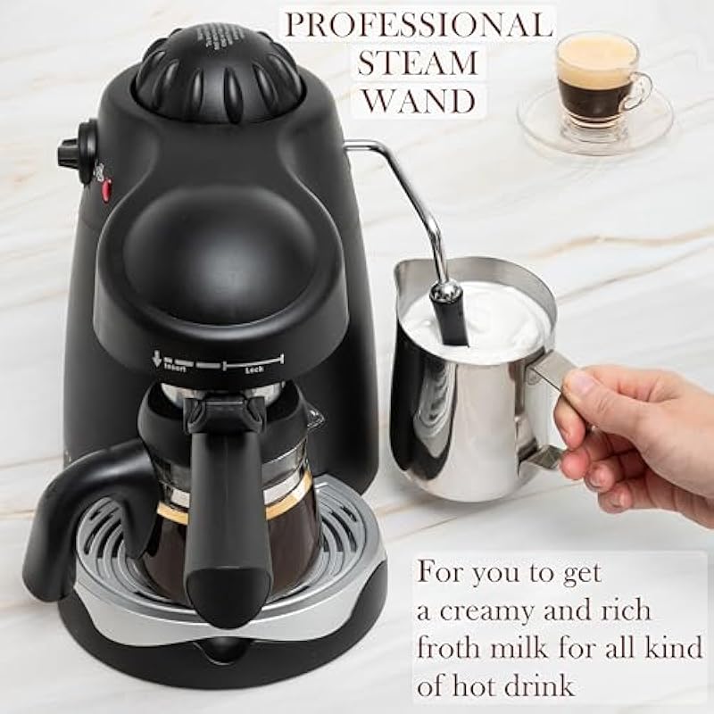 - Mini Expresso Maker – This versatile latte, cappuccino machine also comes with a carafe 1-4 cups scale to determine the ideal amount of water needed for brewing. This coffee maker has a built-in safety valve boiler for escaping steam and preventing hot. And with an adjustable steam nozzle for perfectly steaming milk or frothing milk substitutes into soft, rich foam within 1 min for a creamy cappuccino & latte.