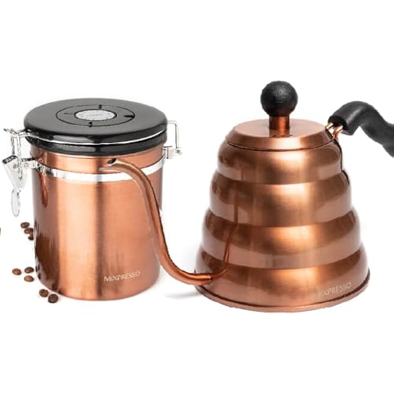Mixpresso Gooseneck Pour Over Coffee Kettle, Barista Pour Control Design, High-Grade Stainless Steel 1.2 Liter Bundle With Bronze Stainless Steel Airtight Coffee Container with Date Tracker For Coffe