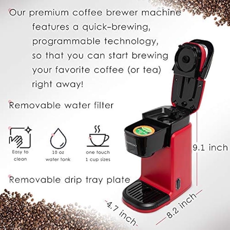 - Instant Single Cup Coffee Machine: Our single serve coffee maker is what you need to start your day productively! Compatible with k-cups and easily programmable, our coffee machine can instantly brew your favorite ground coffee with our quick-brewing technology! Size: 9Inch H x 4.7Inch W x 8.2Inch L