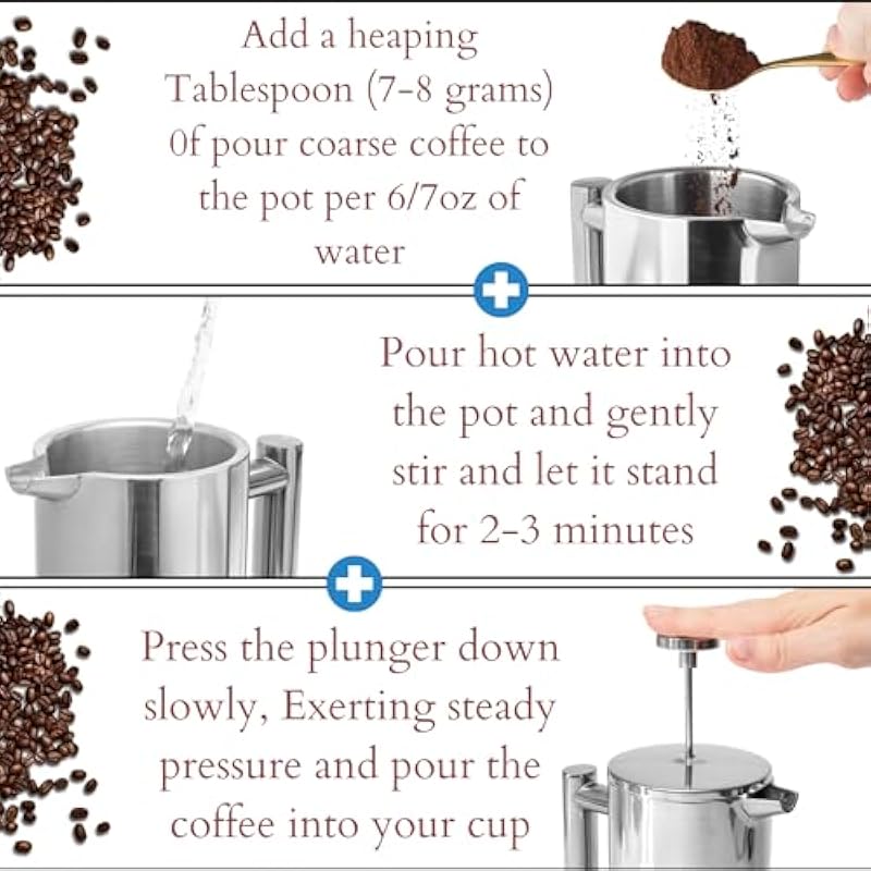 - Double-wall Construction: Our french press maker double wall insulated pot keeps coffee or tea warm longer while the exterior stays cool — safe and convenient for home or travel use