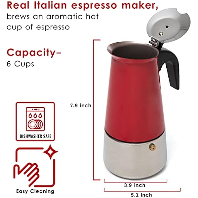 Mixpresso Stovetop Espresso Coffee Maker 10oz/6 Espresso Cup, Moka Coffee Pot with Coffee Percolator Design, Stainless Steel Stovetop Espresso Maker, Italian Coffee Maker, Bundle With 3 Piece Red Can