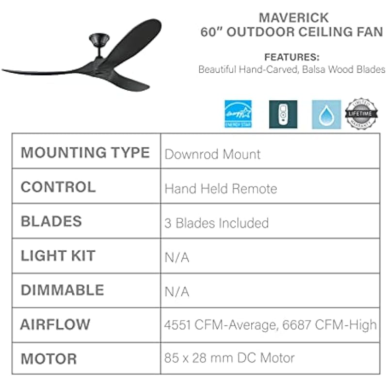- FAN BLADES: 3 Outdoor Approved Matte Black Blades (60″ Span / 12° Blade Pitch); CFM: 4551
