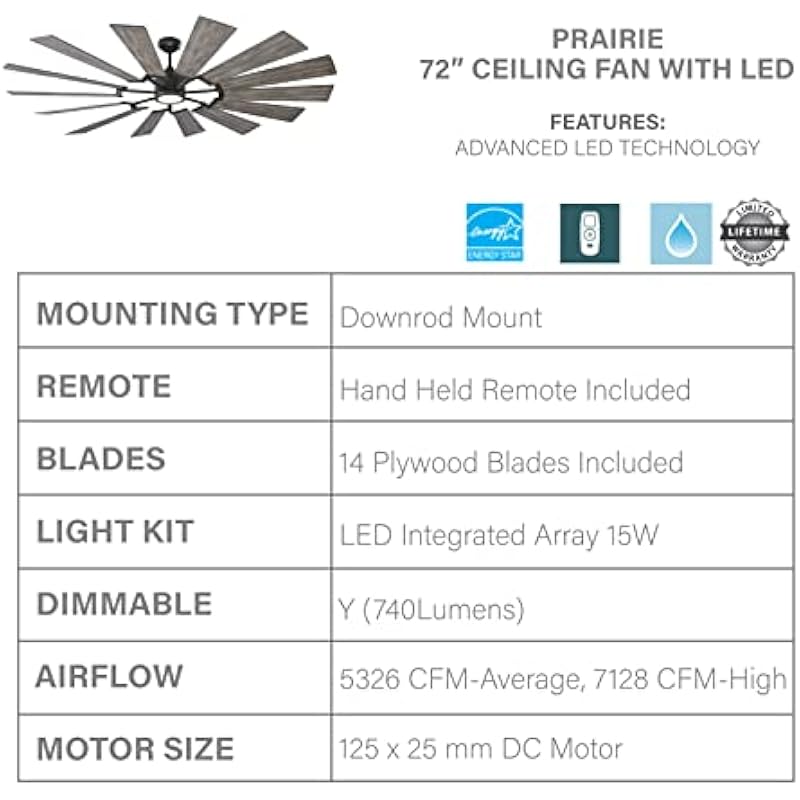 | Model Name | ‎14PRR72AGPD Prairie Grand Windmill Energy Star 72″ Outdoor Ceiling Fan with LED Light and Hand Remote Control, 14 Wood Blades |