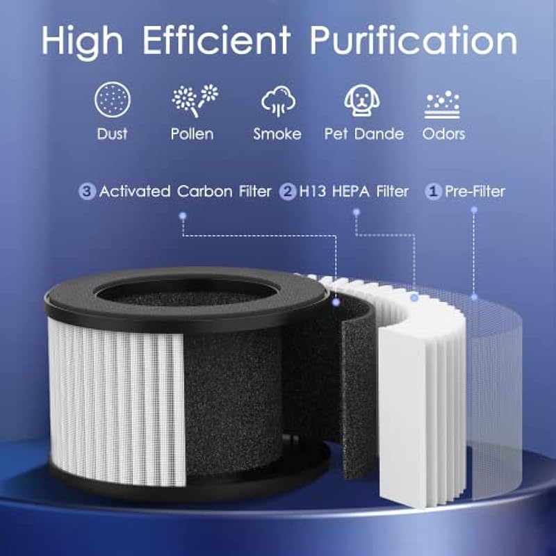 - H13 True HEPA filter: 3-stage filtration, captures dust, pollen, smoke, odors, and pet dander.