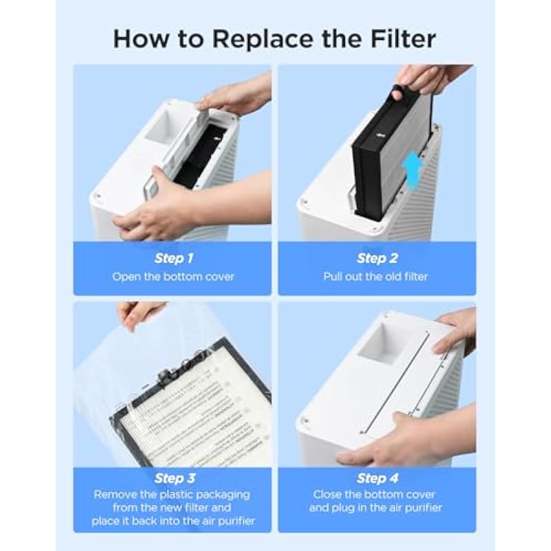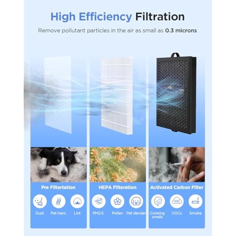 - 3-IN-1 Filteration: Pre-Filter filters pets fur, lint, fibers, hairs; H13 HEPA Filter captures pollen, pet dander, dust; Activated Carbon Filter clean smoke, fumes, VOCs, pet odors, cooking smells, etc.