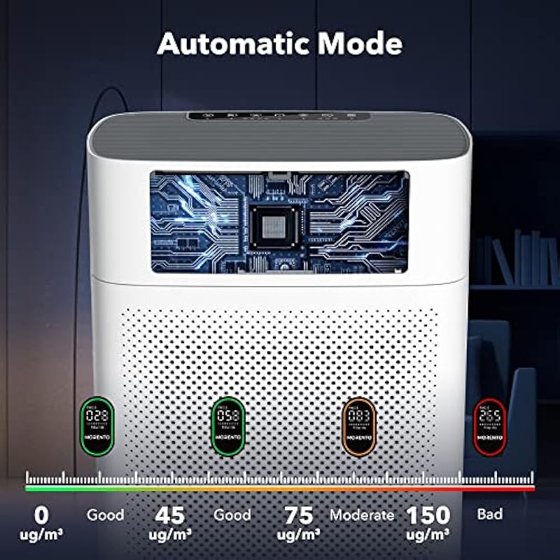 - PM 2.5 Display & Air Quality Sensor: The MORNETO HY4866 bedroom air purifier is equipped with an infrared PM2.5 sensor, which will monitor the air quality in real time and feed it back to the display screen. When the air purifier is in automatic mode, if the surrounding air becomes cloudy, the display screen will appear yellow or red, and the fan will speed up to clean the air faster, which is a best air purifier for wildfire smoke. Let you know the health of the air at any time