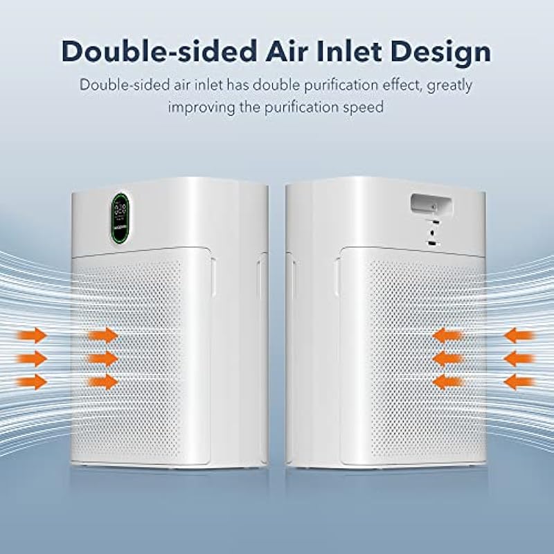 - Dual Side Air Intake: This air purifier for home large rooms is designed with dual air intakes. Compared to the single air inlet design, it performs purification work on both sides simultaneously, greatly improving the purification speed. Our air purifier for allergies CADR is up to 300 (m ³/ h) For a 1076 square foot/100 square meter room, it can refresh the air every hour, giving you a healthy and fresh breathing environment in smoke