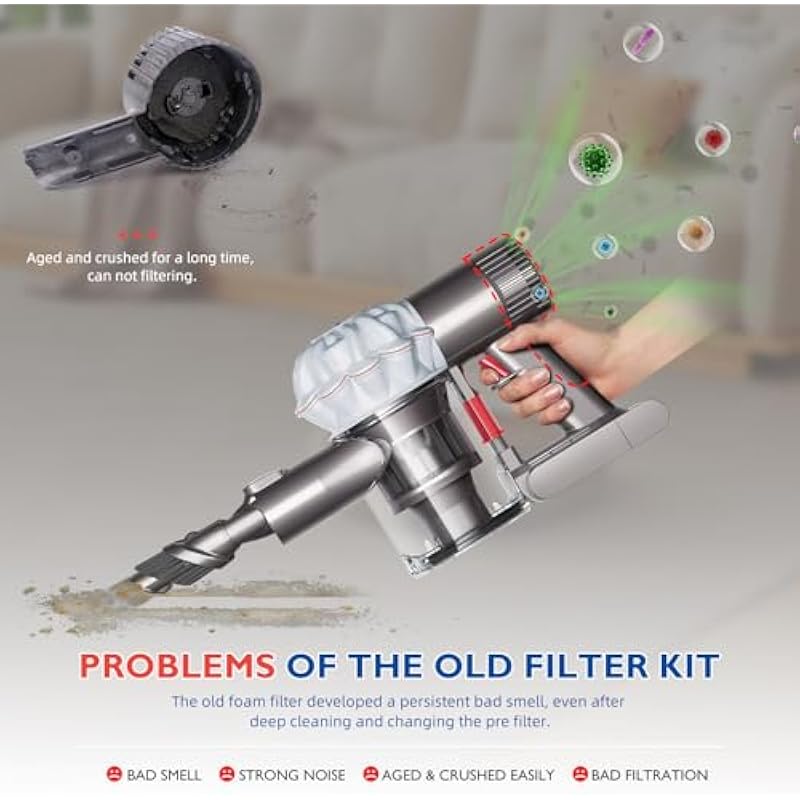 - Problem of Old Filter Kit: The old foam filter developed a persistent bad smell, even after deep cleaning and changing the pre filter. And the old foam filter has been aged and crushed after using for long time, it will reduce the suction performance too. The solution is replace our V6 motor back cover replacement, it include the deflector cover and HEPA filter