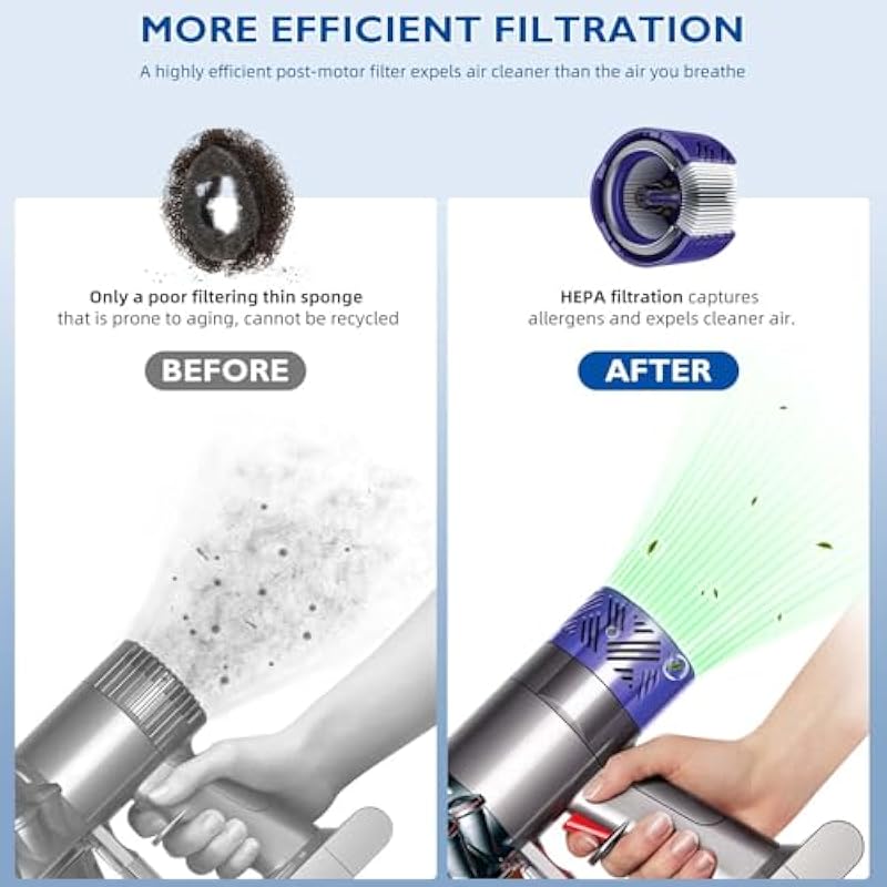 - Upgraded V6 Filter Kit Effect: After replacing our V6 filter replacement upgraded kit, high-quality meterial made V6 post HEPA filter and pre filter could increase 3 times suction performance, bring us healthy and fresh experience